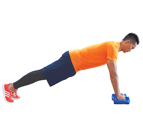採伏地挺身姿勢,雙手撐在肩膀正下方。身體從頭到腳跟應形成一直線。