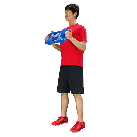 手握平衡鈴外側短把,平衡鈴放置胸口,雙腳打開與肩同寬,腳尖朝外。