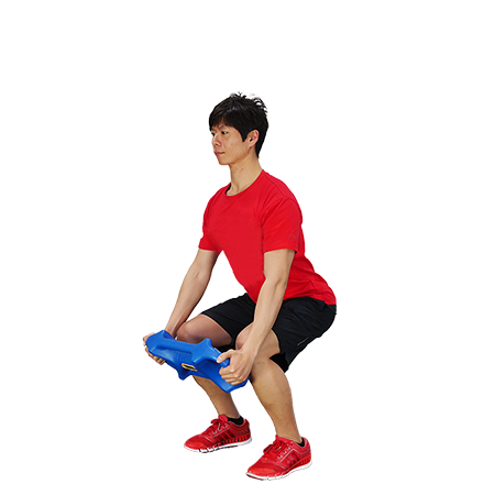 雙腳距離與肩同寬,腳尖略向外張開15度左右。動作是一個「坐」下來動作,上半身盡量挺直,想像是要坐在一張椅子上,然後慢慢的往下,不是膝往前推,而是臀部往後坐,訓練時勿讓膝蓋超過腳尖,容易讓膝蓋的關節受到壓迫,反而會造成酸痛的現象,而非訓練到大腿的肌群。