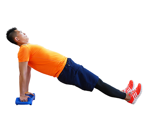 手肘和膝蓋打直。肩膀後縮、夾緊臀肌,雙手撐於肩膀正下方,