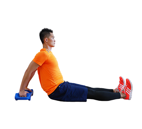 雙腿併攏坐在地板上,呈 L 形坐姿,將平衡鈴,在身體後方,手握平衡鈴內側短把。
