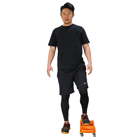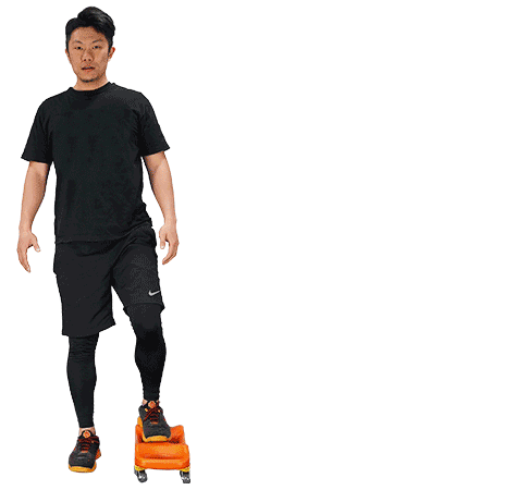 平衡鈴上卡滑盤,呈站姿,單腳踩在平衡鈴核心位置,將臀部後推,並將滑盤往外滑向身體外側,同時放低臀部與彎曲另一隻腳的膝蓋。