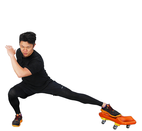 平衡鈴上卡滑盤,呈站姿,單腳踩在平衡鈴核心位置,將臀部後推,並將滑盤往外滑向身體外側,同時放低臀部與彎曲另一隻腳的膝蓋。